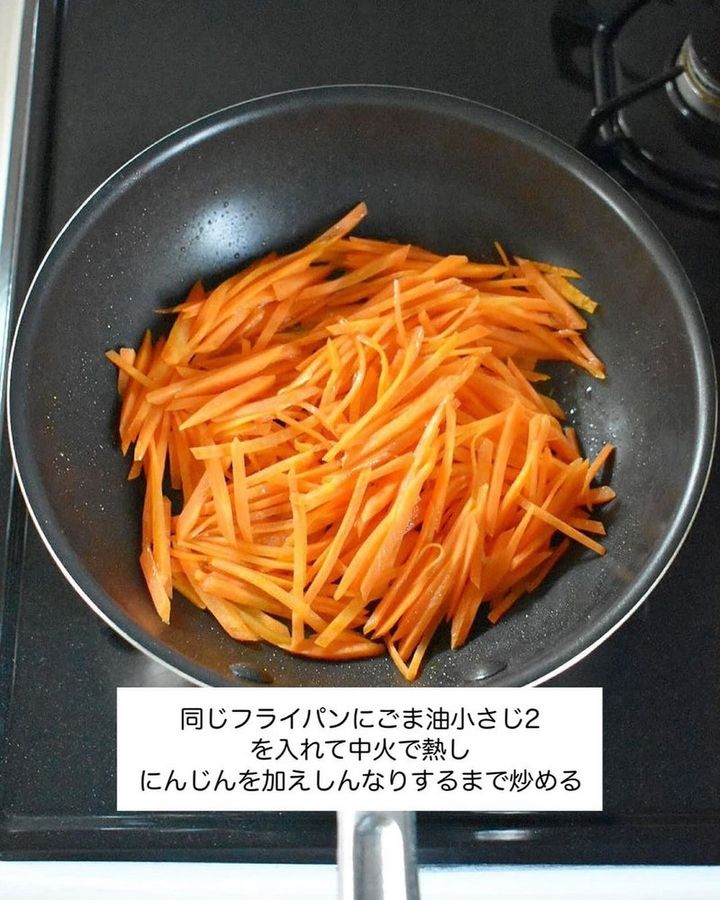 3. 同じフライパンにごま油を入れて中火で熱し、にんじんを加え、しんなりするまで炒める。