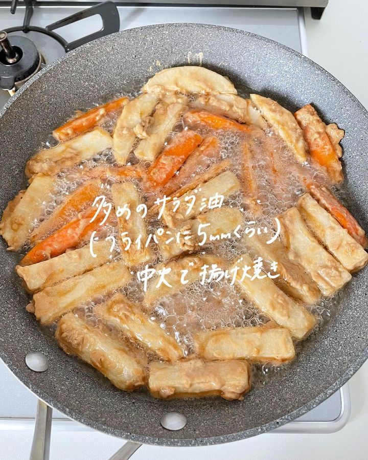 3. 多めの油(フライパンに5mmくらい)で揚げ焼きにする(中火)。
