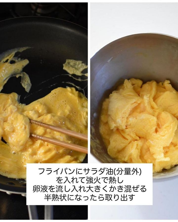 2. フライパンにサラダ油(分量外)を入れて強火で熱し、A(◎)の卵液を流し入れ大きくかき混ぜる。半熟状になったら取り出す。