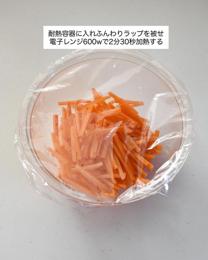 2. 耐熱容器に入れてふんわりラップを被せ、電子レンジ(600W)で2分30秒加熱する。