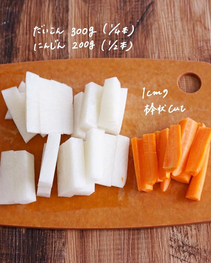 1. 大根とにんじんを1cmの棒状に切り、Aを揉みなじませる。