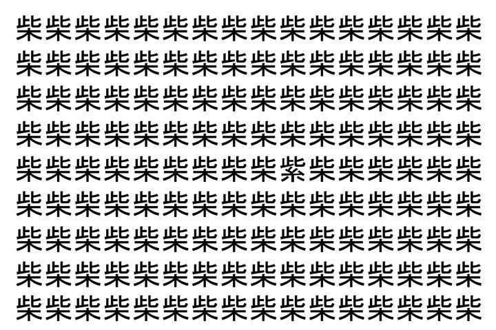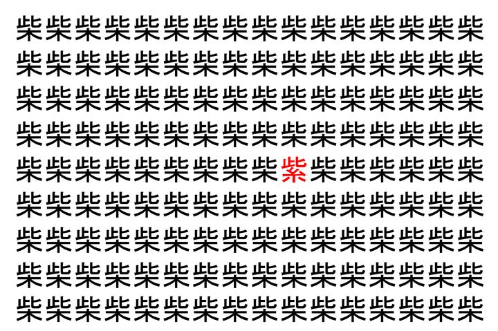 画像の中には、「柴」という漢字が縦に9行、横に16個並んでいます。 全部で144個となりますが・・・、そのうち1つは「異なる漢字」となってますよ!!
