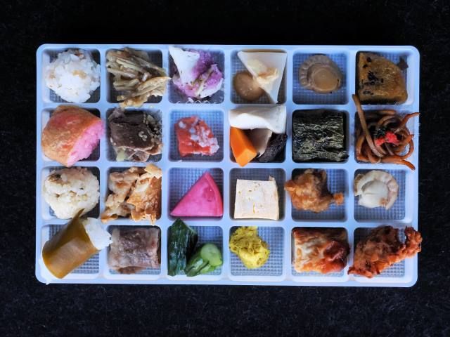普通、駅弁の容器は多くても9分割ですが、この弁当は24分割もされており、青森のおいしいものがすべて詰められています。日本随一の手間がかけられた駅弁ですね。