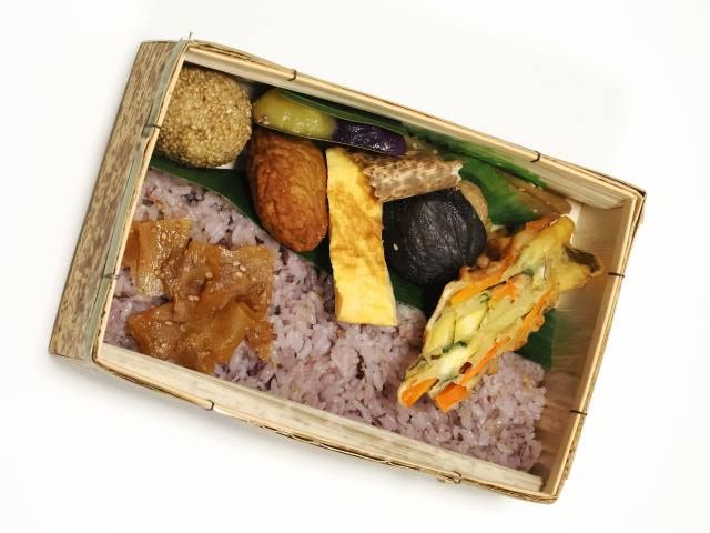 津軽地方の郷土料理、名産を中心に青森県の味をひとくちずつ24種類集めた、欲ばりな弁当。ご飯は青森名物のほたてを使った「ほたて飯」、味付けご飯「しじみご飯」など4種類。赤い酢飯を詰めた津軽名物のいなり寿司、もち米を蒸して作られる「すしこ」や「紅鮭寿司」。