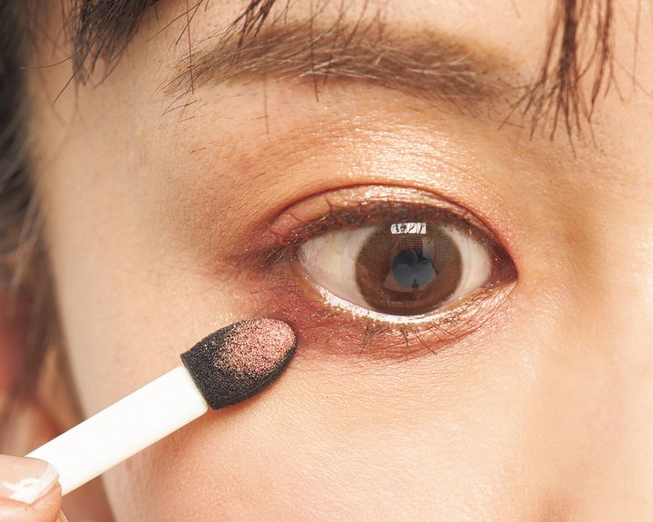 アイメークをすると目周りの悩みが余計目立つ気がする…カラーパレット右上を上まぶたに入れてくすみを飛ばし左下を目頭と目尻にのせて血色感アップ。大きめのチップに右上と左下を混ぜて取り、下まぶたにしっかり入れてぷっくり感を。