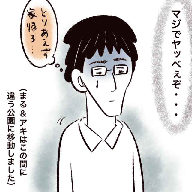 帰宅後、やつれさんから公園でのやり取りを聞いたまるさんは絶句。