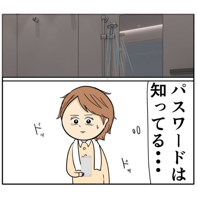 お風呂に入っている良し男さんのスマホを手にしたすみれさん、