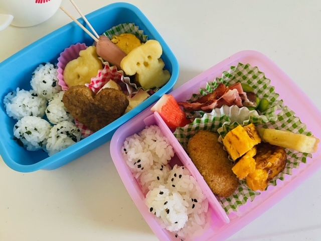 ある日の自宅弁当。青は息子の。ピンクは娘が自分で作ったもの。