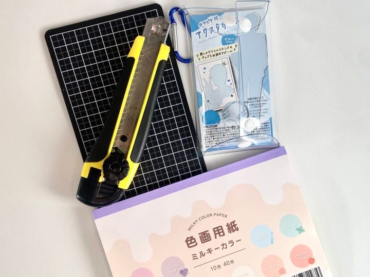 「カラビナ付 アクスタケース」以外に用意したものは以下。推しの素材以外はすべてダイソーで揃えられます。