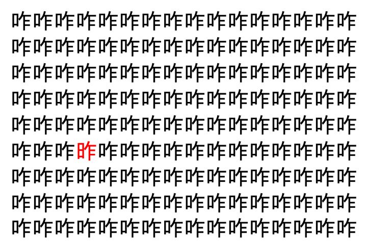 画像の中には、「咋」という漢字が縦に9行、横に16個並んでいます。 全部で144個となりますが・・・、そのうち1つは「異なる漢字」となってますよ!!