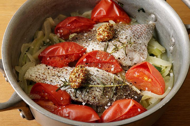 鯛、トマト、ローズマリーを加え、白ワイン、水50mlを注ぐ。蓋をして弱めの中火で8~10分蒸す。塩、胡椒で調味し、粒マスタードをのせる。