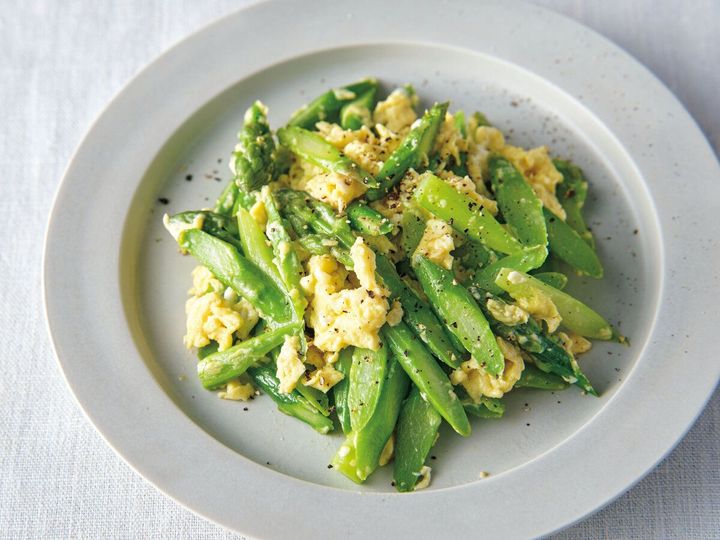 (2)フライパンに水大さじ2、アスパラ、塩少々を入れて強火にかけ、さっと混ぜてふたをし、1分蒸しゆでにする。ふたを取って水分をとばし、バター10gを加えて溶かし、卵液を回し入れる。弱火にし、混ぜながら炒めて器に盛り、粗びき黒こしょう少々をふる。