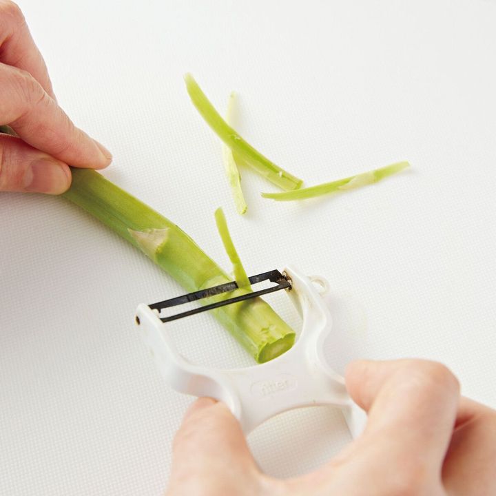 アスパラの下から3~4cmの皮は堅く、そのまま調理すると口当たりがわるくなることがあるので、ピーラーで削るようにしてむきます。皮をむくことで火の通りもよくなり、一石二鳥です。