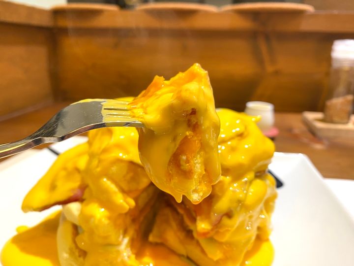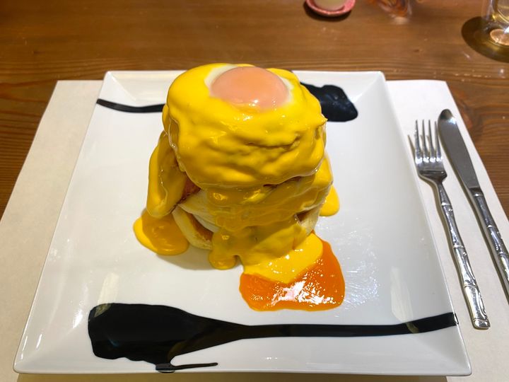 食事やデザートとして楽しめるさまざまなラインアップが揃っていて、なかでもおすすめなのが「ベーコンと目玉焼き」2200円です。ぜいたくに盛られた3段のパンケーキの間には蜂蜜とマーマレード、ベーコンがサンド!さらに目玉焼とたっぷりのオランデーソースがトッピングされています。
