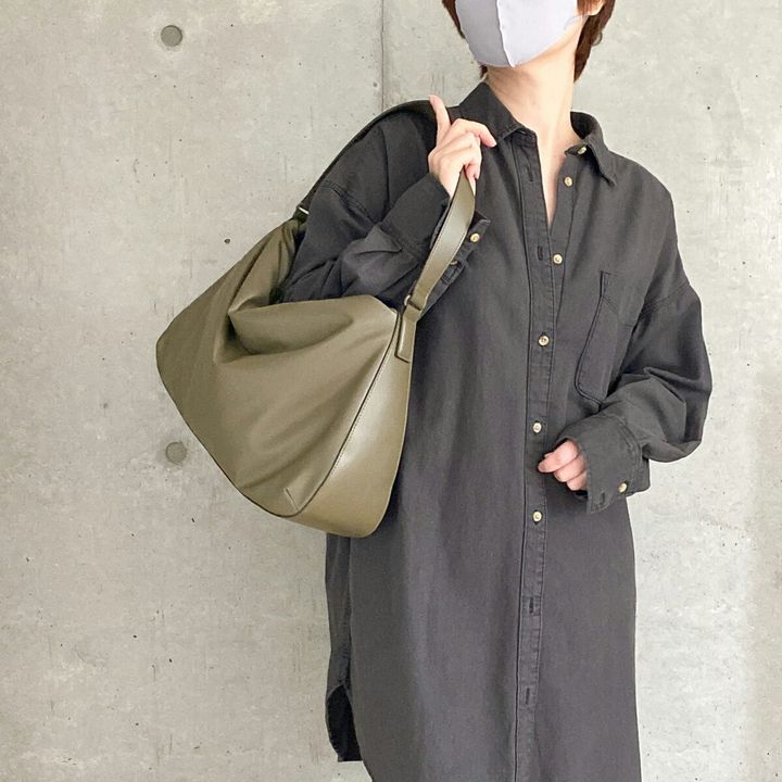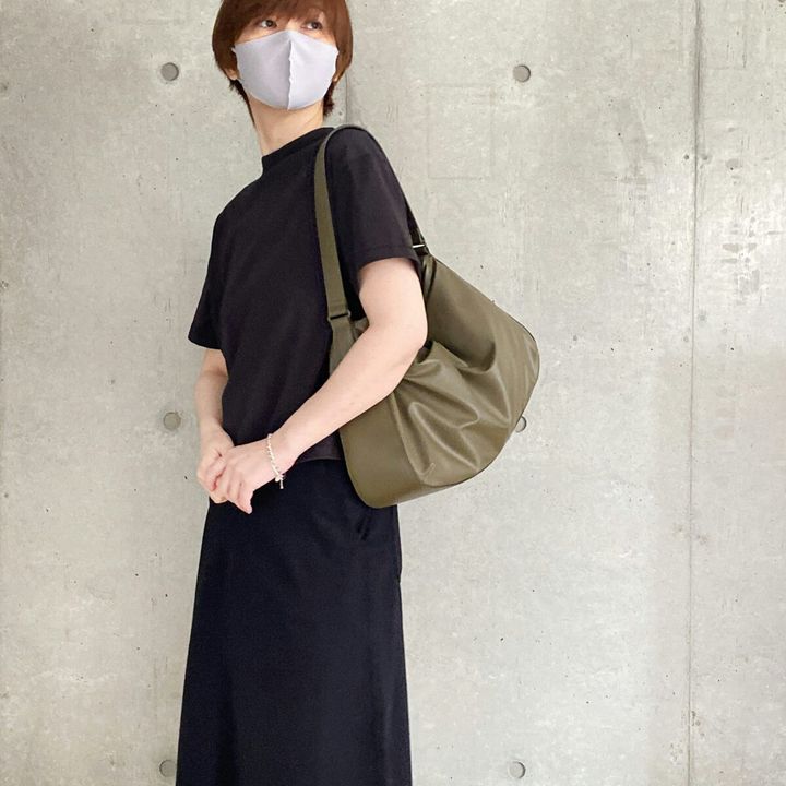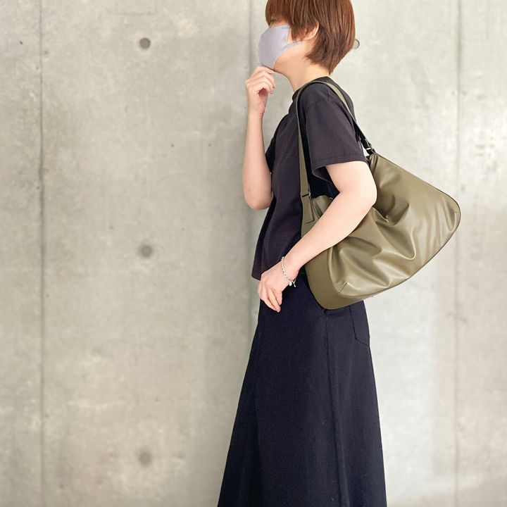大人っぽいBLACKコーデ。OLIVEカラーが引き立ちます。重くならないように、スッキリとしたロングスカートや半袖のTシャツに合わせるのがおすすめです。肩にかけてもバランス◎。