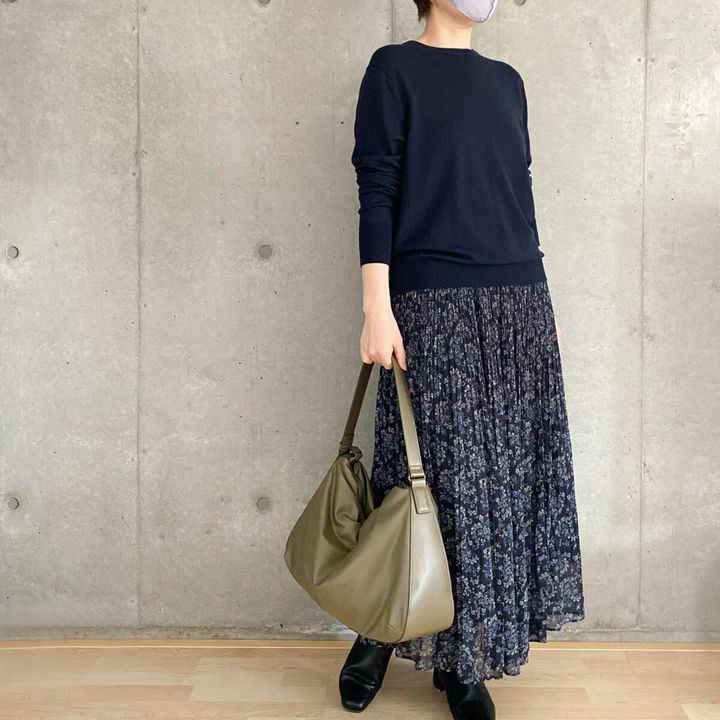 落ち着いた印象のNAVYコーデ。シフォンスカートと短め丈のニットで上品な雰囲気に。OLIVEカラーはベーシックなカラーでまとめるとバランスよく。オフィスコーデにも活躍しそう。