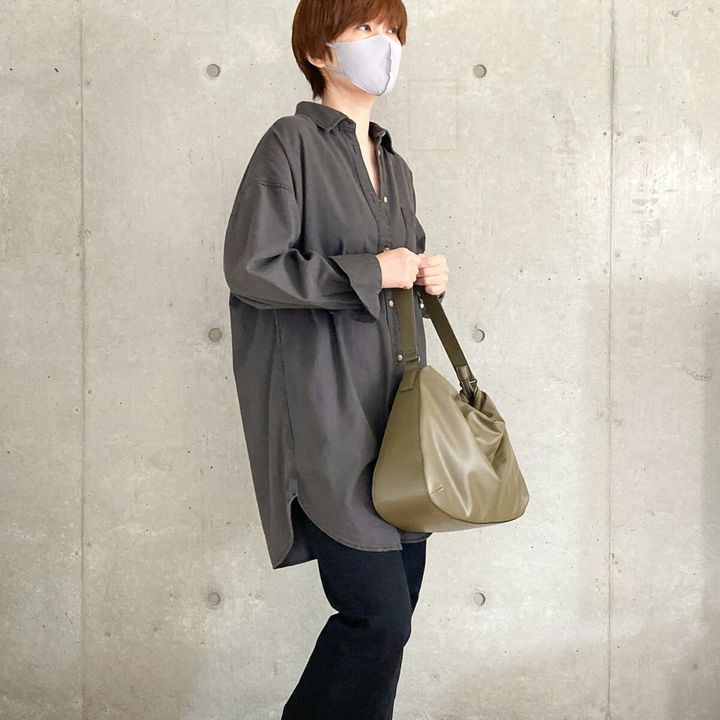 おしゃれ度が高いGRAYコーデ。思いっきりカジュアルなコットンのロングシャツで合わせてみました。光沢のあるパフィーバッグがほどよくキレイ見えします。大人の女性にも合わせやすいコーデです。