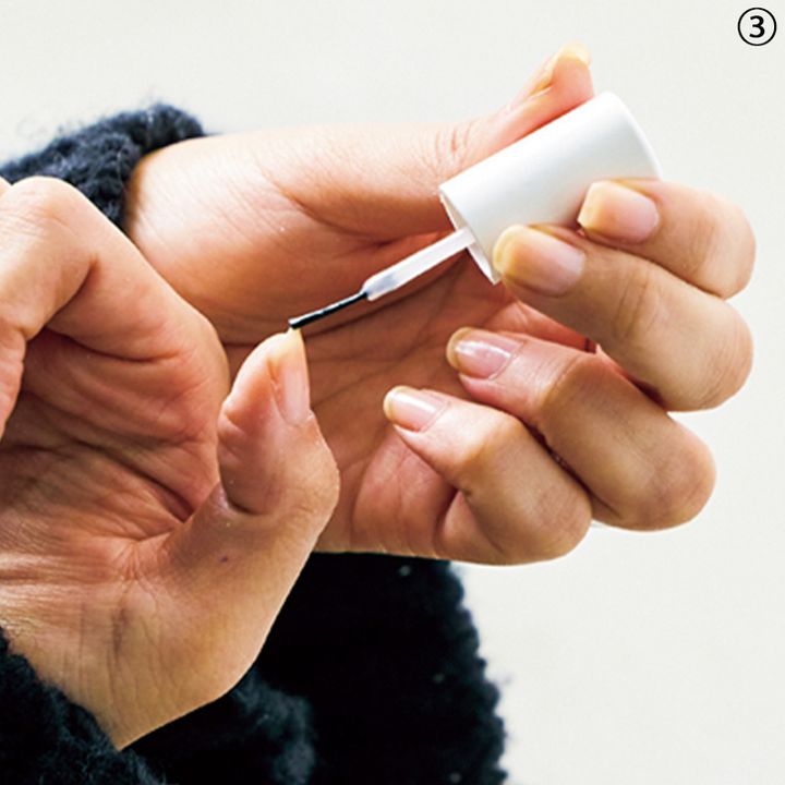 ③ 3.のベースコートを塗る。ポリッシュも同様で、爪の裏側の縁から塗ると持ちがよくなる。