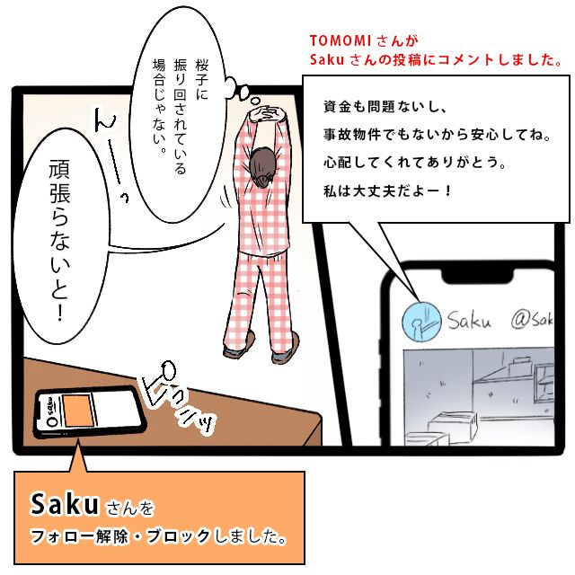 桜子の投稿に、事故物件ではないから心配しないでとコメント後、桜子をフォロー解除・ブロックすることで関係を断ちました。