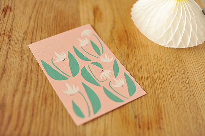 ランタンをさかさまにしたような形の淡い紫色の小さな花を咲かせ、短い期間だけ咲く貴重な春の象徴ともいえる花を、セキさんがデザインしたカード。裏面には、東川からのお便りが入っています。