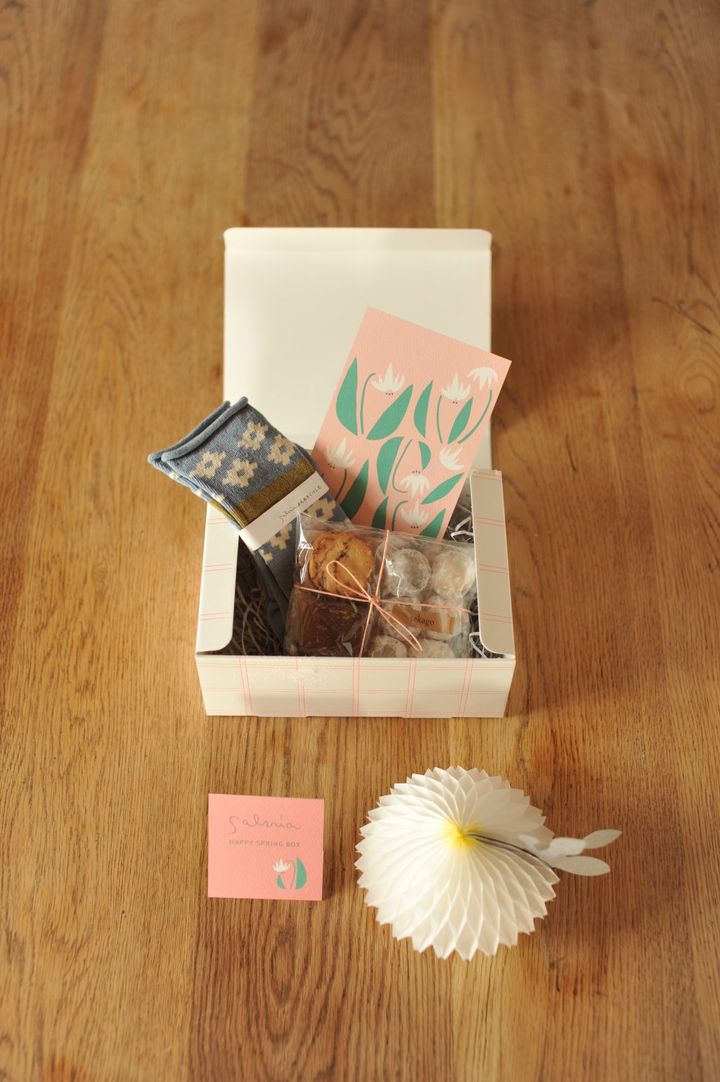 そんなサルビアが、ギフトBOX「HAPPY SPRING BOX」を数量限定で発売。焼き菓子や春のおしゃれにぴったりの靴下、カード2種類を詰め込んだ、セキさんが厳選した春をお祝いする特別なギフトセットです。