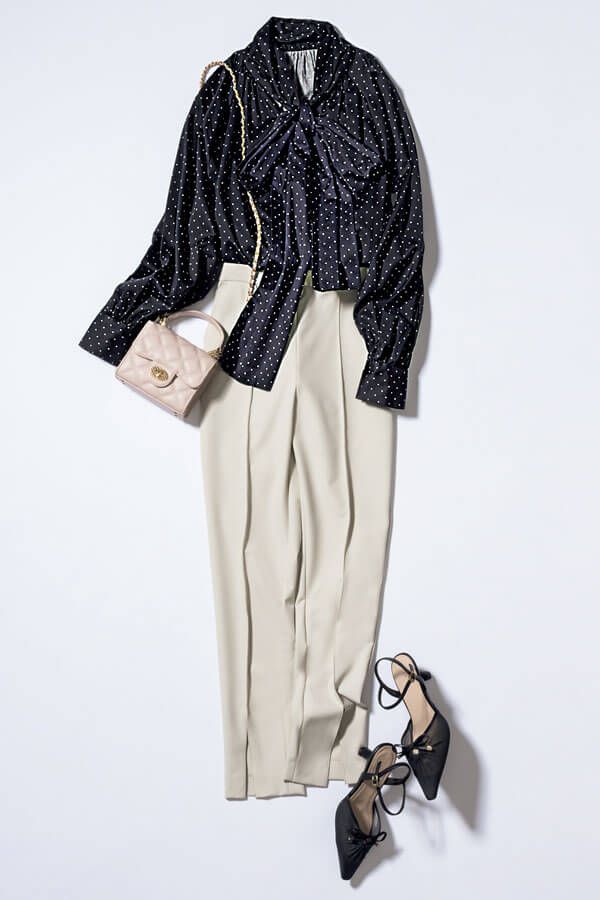 ブラウスでベージュパンツをエレガントに。品格と華やかさを両取りできるとろみ素材のブラウスは、デートのパンツスタイルにうってつけ。ピンドットで甘さを足して可愛さもトッピング♪ レディライクなミニバッグやヒールで女っぽさの底上げも。