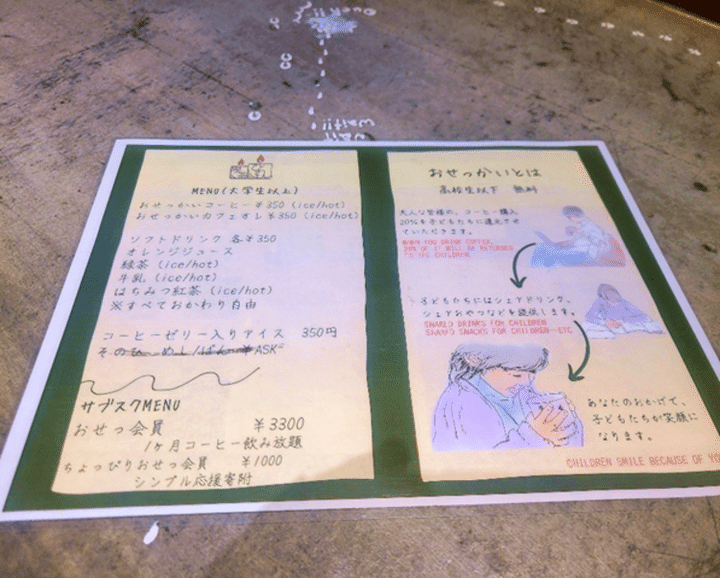 「大人(大学生以上)が頼んだコーヒーやカフェオレの売り上げの20%が“おせっかい貯金”になって、子どもたち(高校生以下)に還元される仕組みになっているんです」
