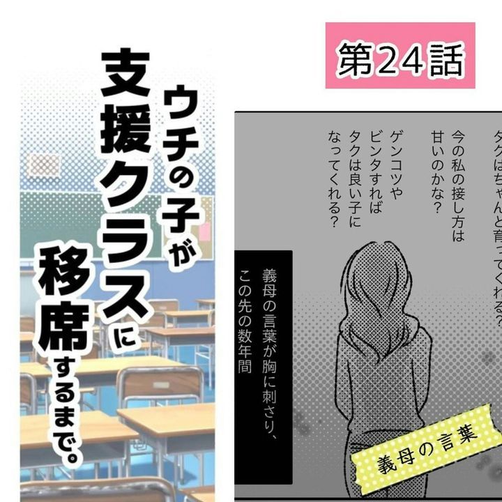 これは、もっつん(@mocchan_diary)さんが小学1年生の息子の発達に悩み、支援クラスへの移籍を決意するまでのお話です。担任やスクールカウンセラーなど周りの力を借りながら、ありのままのわが子と向き合う母の葛藤を描きます。もっつんさんが息子の子育ての悩みを呟くと、義母は自身の子育てについて自慢げに語りだしました...。『うちの子が支援級に移籍するまで』第24話をごらんください。