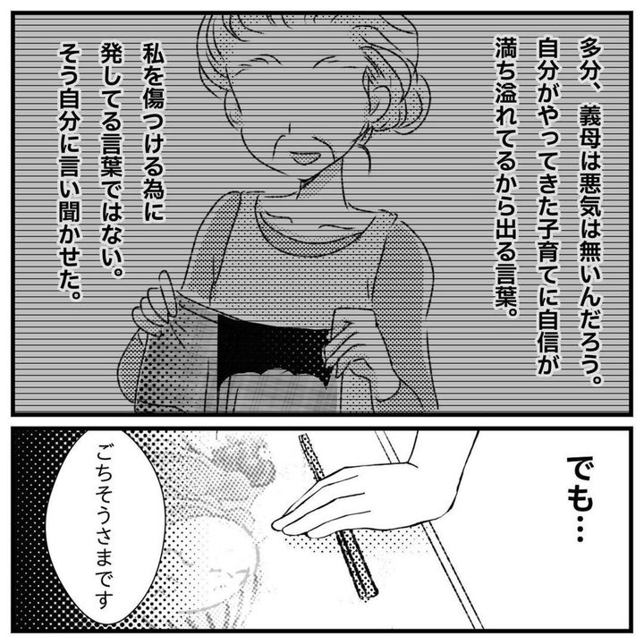 義母の子育ての話は、今の時代では虐待にあたるような内容で聞くに堪えませんでした。傷つける意図はなかったようですが、もっつんさんには自身の子育てを否定されているように感じられました。