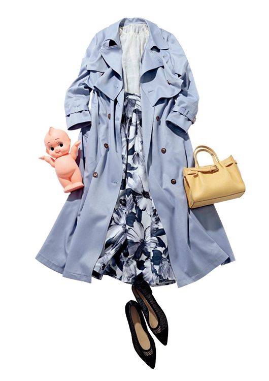 好印象な淡めブルーのカラーコートで肌寒い日も春気分を満喫。スプリングコートの下は、花柄スカートとブラウスでメリハリをつけて。くすみトーンでまとめることで、コーデ全体に統一感もでて◎。