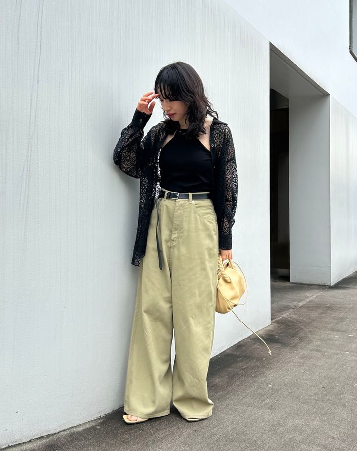 「太めのベージュのパンツはともすると“ほっこり”しがちなところを、他をブラックでまとめることで大人っぽくマニッシュな雰囲気に昇華。レースシャツは透け感があるのでインナーにもきちんとこだわってデザイン性のあるものをセレクトし、マダムっぽくならないようなコーディネートに仕上げました」