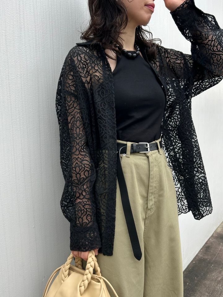 「ひらひらしたフラワーモチーフなどのレースが多いなか、コード刺繍のような柄のレースで甘くなり過ぎずモダンな雰囲気で着られるシャツは大人も取り入れやすい1枚です。またシルエット自体はメンズライクなオーバーサイズなシャツ型なので、ヘアスタイルの柔らかさと相反するムードで合わせられるのも気に入っています」シャツ¥24,200(ジャーナル スタンダード レサージュ/ジャーナル スタンダード レサージュ 丸の内店)