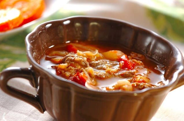 牛肉の細切れが入った、食べごたえのあるスープです。水煮トマト缶を使って、野菜がとっても甘い味わいに仕上がりますよ。スープでお腹を満たしたい時にぜひお試しを!
