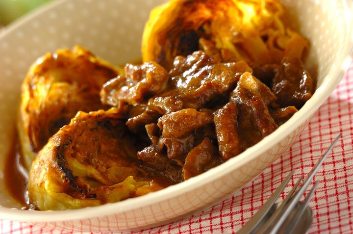 フライパンで10分!牛肉の薄切りと、大きめに切ったキャベツをカレー味で煮込んだ1品です。煮込んでいる途中で、キャベツを裏返すと味が均等に染み込みますよ。