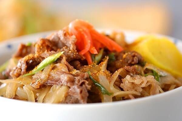 牛肉のこま切れ、玉ねぎなどで作る牛丼です。酒やみりん、砂糖など、さっぱりとした味付けで仕上げているのでご飯がすすみます。お好みで一味唐辛子や七味唐辛子をプラスして。