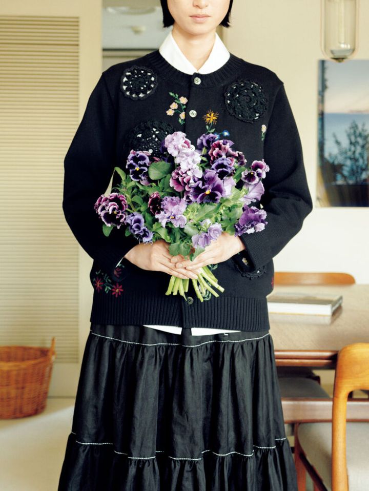 『ル・ベスベ』の松岡龍守さんが選んでくれた今月の花は、先月号で京都『スー・ボワ』の鈴木大介さんが紹介してくれたものと同じくパンジー。松岡さんはブルー系のグラデーションでまとめ、統一感のあるブーケに。「長らく鉢植え、庭植えで親しまれてきたパンジーに、切り花用の品種が出回り始めたのはこの数年のこと。茎を長く、まっすぐに作り込んでいるので、ボリュームを生かして楽しめるようになりました。長めの茎なら少々しおれてきても、ナチュラルな雰囲気でまたきれいなんです」(ル・ベスべ 03−5469−5438) カーディガン¥115,500、シャツ¥19,800、スカート¥71,500(タオ/コム デ ギャルソン 03−3486−7611) その他スタイリスト私物