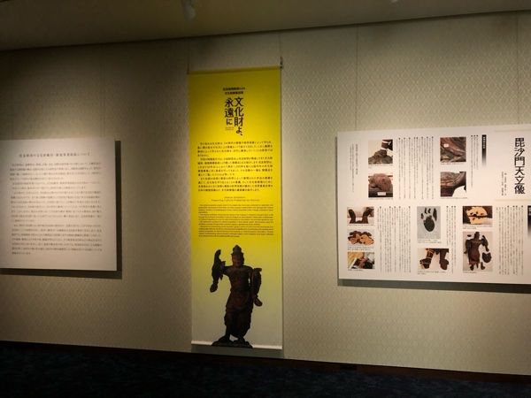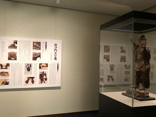 《毘沙門天立像》(平安時代)の作品の修復過程パネルと修復後の作品です。