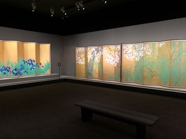 《柳桜図》の隣には《燕子花図》と季節感が感じられる空間です。展示室内は四方四季連作の金地大屏風に囲まれており、作品のスケール感が体感できる空間となっています。