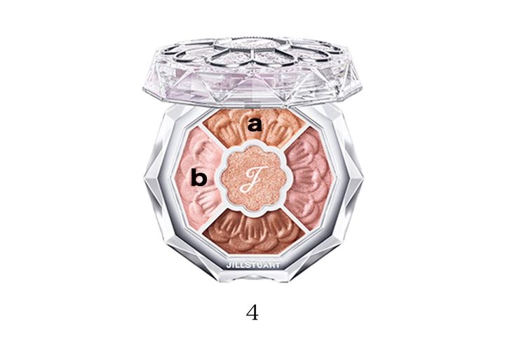 1.スキントーンカラーは単色使いではなく、重ねることで深みと色気のある目元に。1のアイシャドウはaをアイホール狭めにのせてから、二重幅にbのラメをのせる。