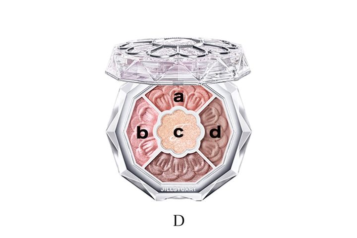 2.おでこや小鼻などテカリやすい箇所のみBを。チークはCを頬内側からこめかみまで、ふわっとのせる。目元はDaをアイホール広め、bを上からアイホールにレイヤード、目頭1/ 3にcを。目下はa+dを混ぜて目頭から目尻に、目頭1/ 3にcを重ねる。