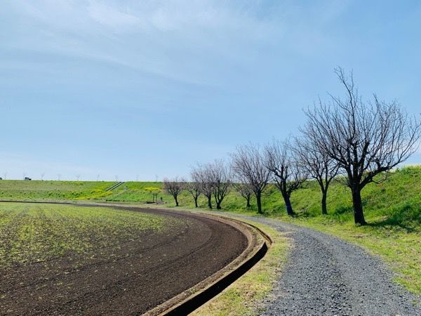 土手を遊水地と反対側に降りたところにも、桜並木を発見!