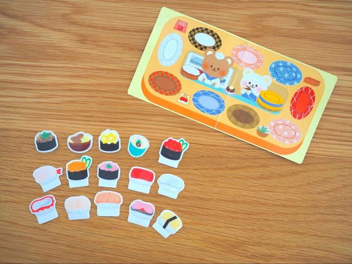 シールを貼ってみると、本当に回っているみたいですよね。お寿司のシールは下の部分を折り曲げると立ち上がってはがしやすくなるので、「次は何にしましょう?」なんて、ごっこ遊びも盛り上がりそう♪
