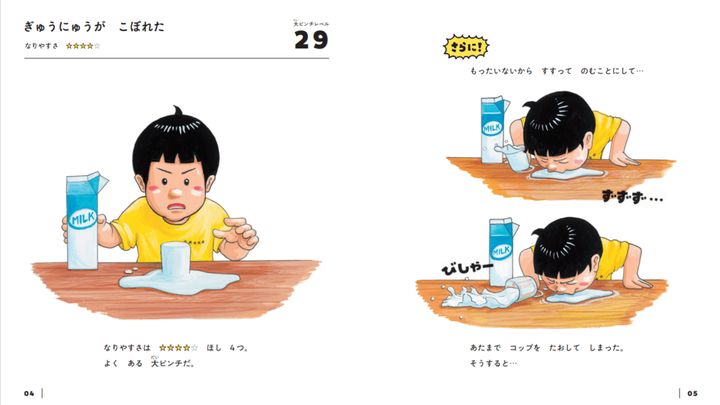 このずかんでは、日常生活の中で子どもが出会うさまざまな大ピンチを「大ピンチレベル」の大きさと、☆1~5の5段階の「なりやすさ」で分類。レベルの小さなものから紹介しています。 ちなみに表紙に登場する「ぎゅうにゅうが こぼれた」は、大ピンチレベル29。なりやすさは☆4。割とよくある大ピンチです。