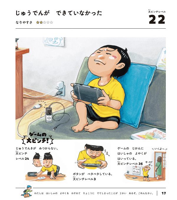大ピンチレベル22「じゅうでんが できていなかった」。なりやすさは☆2です。 幼稚園から帰ってきて、いそいそとタブレットやゲーム機の電源を入れた瞬間、「電池切れてるー!!」と倒れ込む長男が目に浮かぶようです…。わが家では「使ったあとは、自分で元の場所(充電器)に戻す」というルールを徹底しているので、誰も責められず、ソファの上で呆然としている長男の姿は絵本の男の子に重なります(笑)。