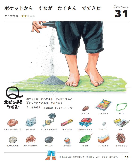 大ピンチレベル31「ポケットから すなが たくさん でてきた」。なりやすさは☆2。 こちらは大人のほうが「あるある」かもしれませんね。幼稚園の外遊びや休日の公園を堪能した夜または翌日に、高確率で出くわす大ピンチではないでしょうか。