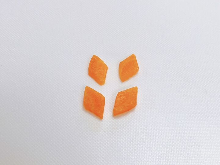 こんにゃくと一緒に煮たにんじんを薄切りにし、ひし形に切ります。