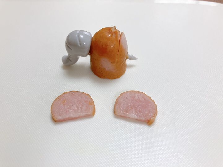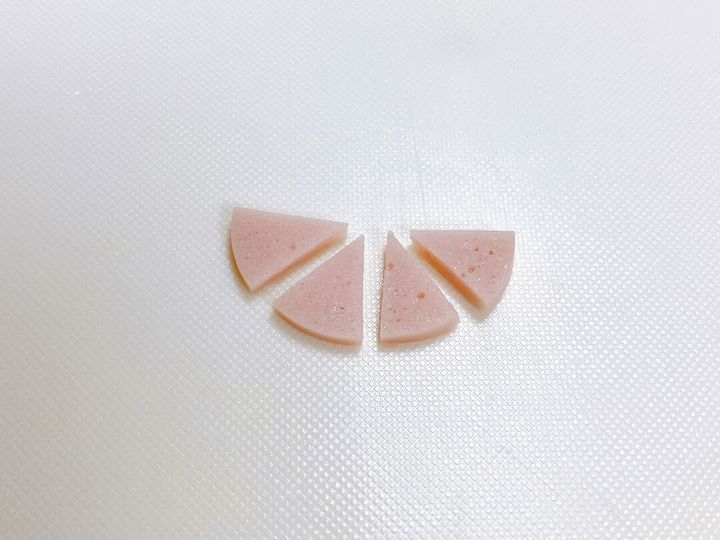 薄切りにした魚肉ソーセージを8等分に切り、耳を作ります。