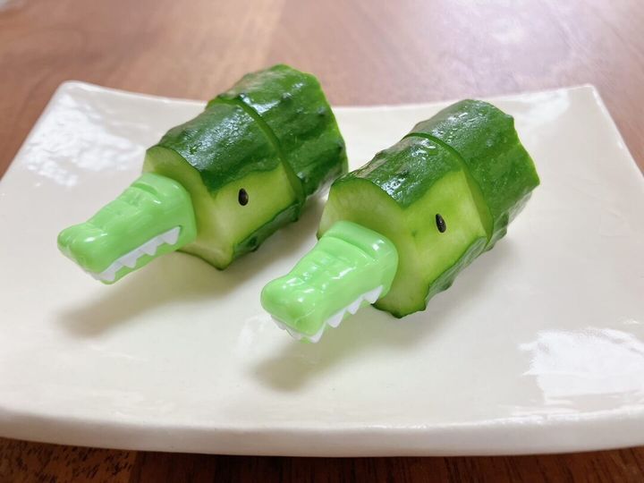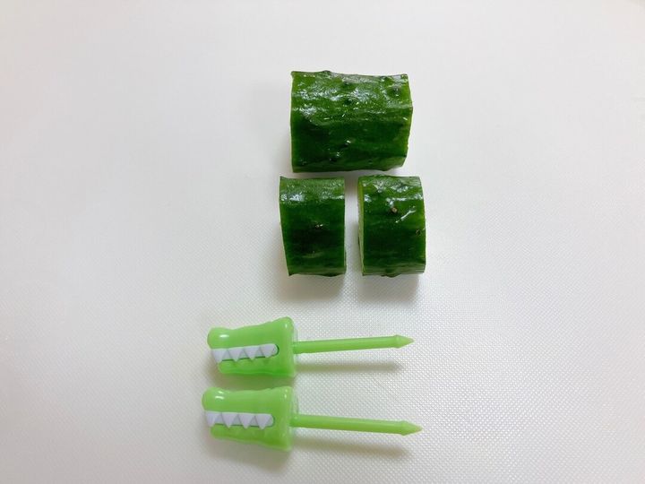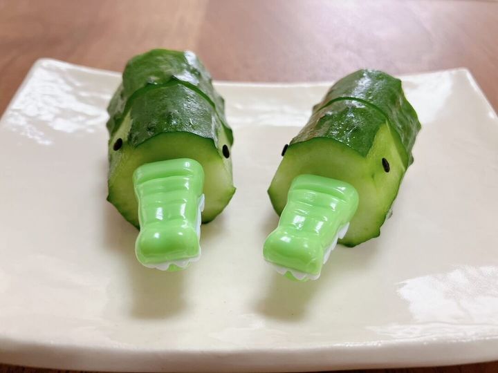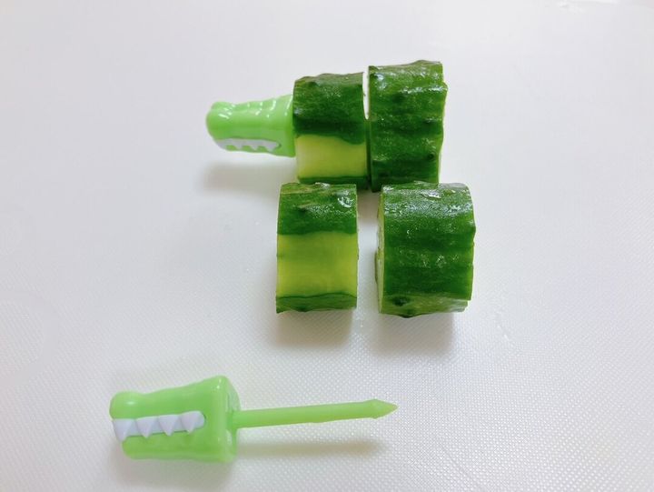 輪切りのきゅうりに刺すだけの「きゅうりワニ」。細めのきゅうりを使うとピックとのバランスがとりやすく、かわいいワニになりますよ♪