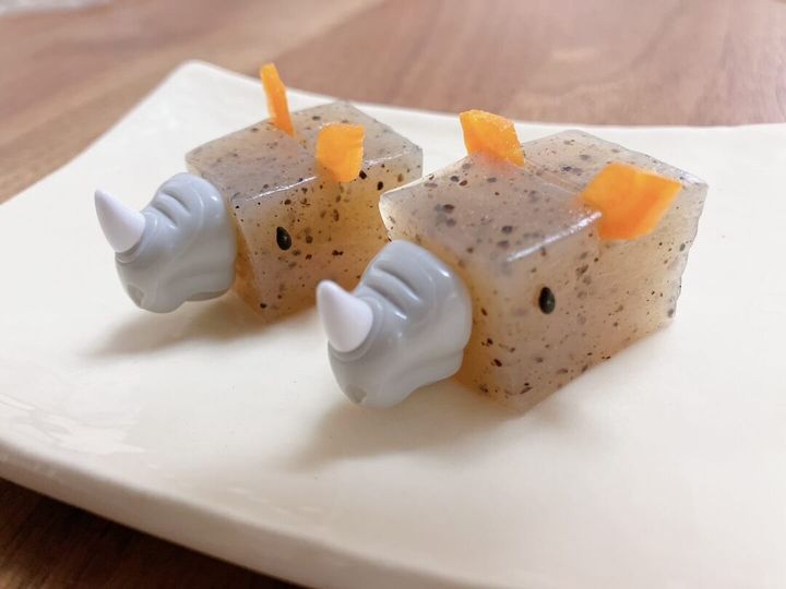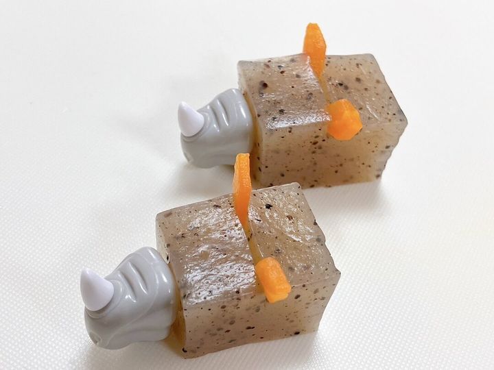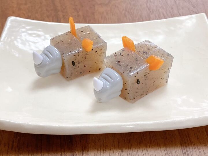 にんじんはやや外側に向かって刺すとサイの耳っぽくなります。黒ごまで目を付ければ完成! こんにゃくは喉につまりやすいので、小さい子どもには与えないようにしましょう。