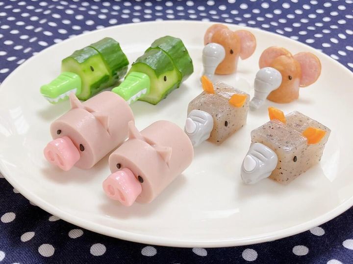 ワニ・サイ・ブタ・ゾウの4種類の動物の鼻をモチーフにしたピックが各2本ずつ入っています。パッケージには、「きゅうり+ワニ」など具体的な使い方のイメージのイラストも! そこで実際にこのイラストを参考に4つのデコおかずを作ってみました。 果たしてパッケージ通りにかわいく作れるのでしょうか…?